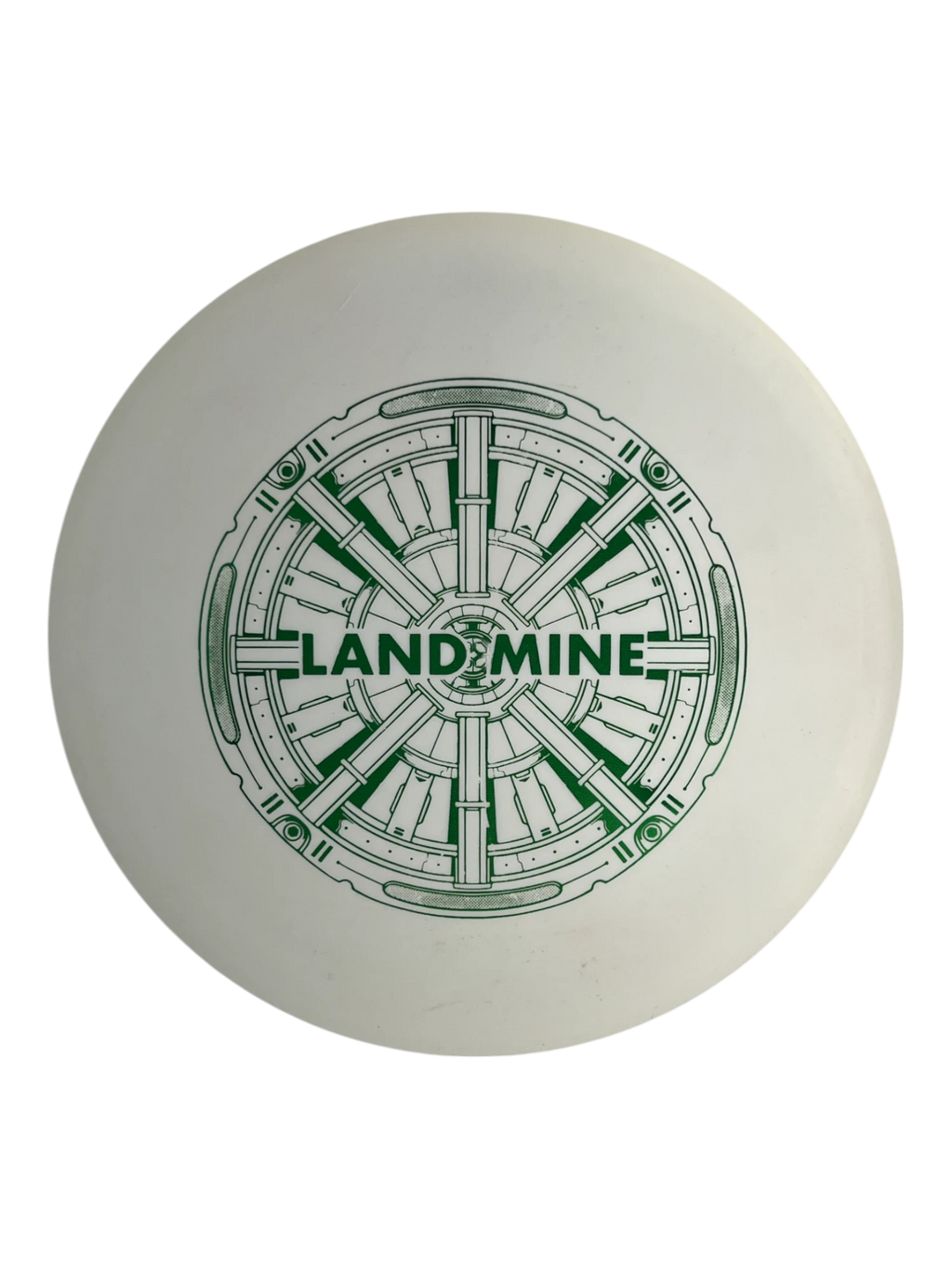 This is the new Land Mine putt-and-approach disc in the Munitions Line of discs. It is in “Weapons Grade” plastic which is a base plastic blend, but with more stiffness than some putter blends. It’s primarily designed for approaches and holds both forehand and backhand lines very well before it drops suddenly to the ground. It has a unique, somewhat experimental rim shape that recalls other putters with a “boxy” rim shape. The Land Mine will stand out when you pull it out of your bag. It will definitely extract unpredictable comments from your card mates.